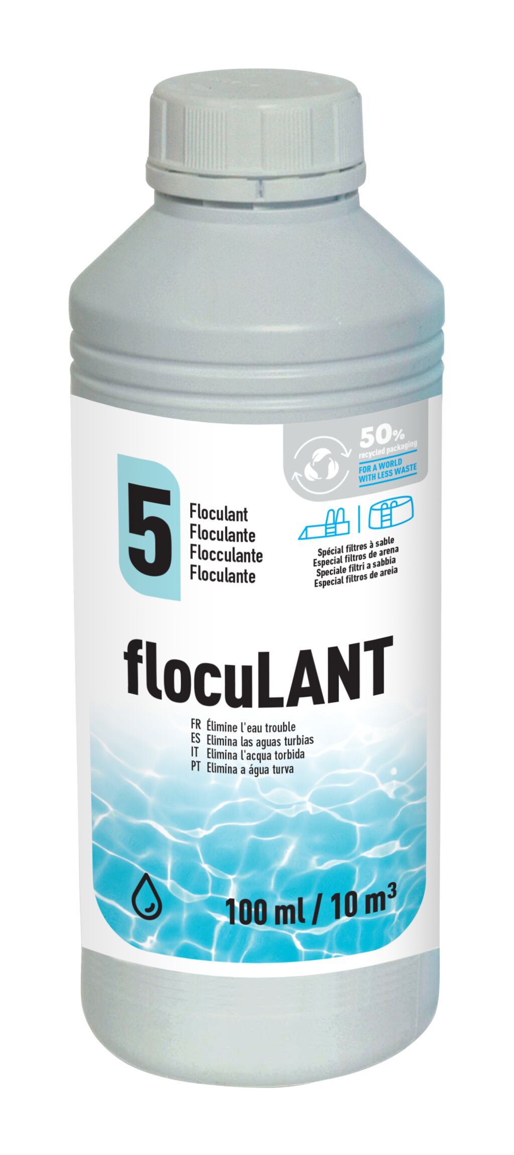 El floculante se utiliza para clarificar el agua y eliminar las materias en suspensión. Su objetivo es eliminar el agua turbia de la piscina ya que la floculación recupera el agua cristalina. Existen dos tipos de floculación: la que se realiza dentro del filtro y la floculación dentro del vaso. GRE propone una amplia gama de floculante para cualquier uso de piscina y para ambos tipos de floculación.