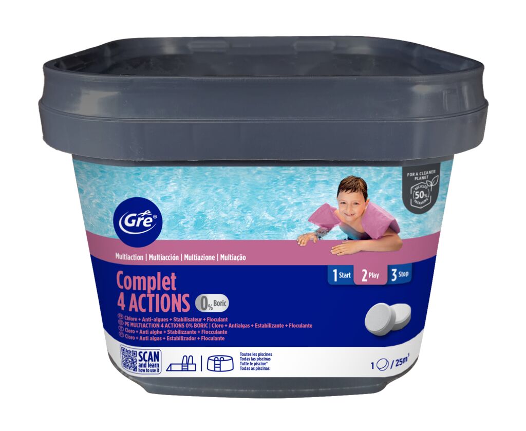 - Fórmula con 4 acciones: cloro antialgas floculante y estabilizador de cloro