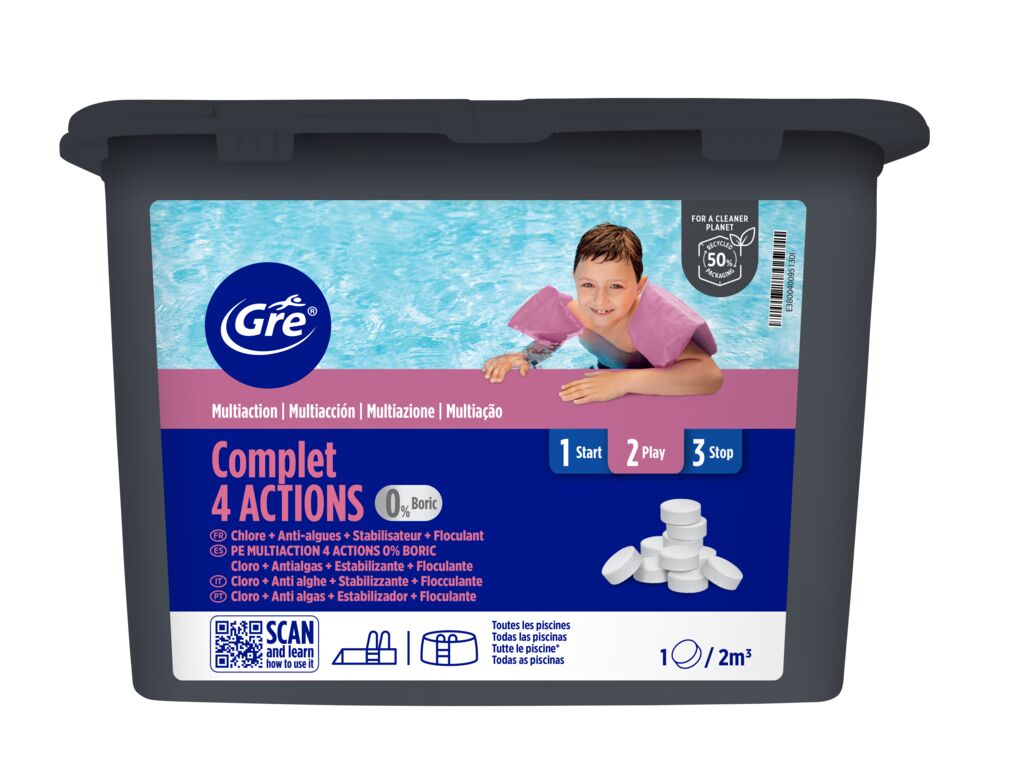 - Fórmula con 4 acciones: cloro antialgas floculante y estabilizador de cloro